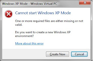I noticed that if I clicked on Windows Virtual PC->Windows XP Mode, because I recently was using the Virtual PC and Windows gave me a most recently used program shortcut, that nothing happens. You won’t get the Cannot Start Windows XP Mode error and button to Create New.