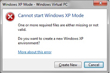 I noticed that if I clicked on Windows Virtual PC->Windows XP Mode, because I recently was using the Virtual PC and Windows gave me a most recently used program shortcut, that nothing happens. You won’t get the Cannot Start Windows XP Mode error and button to Create New.
